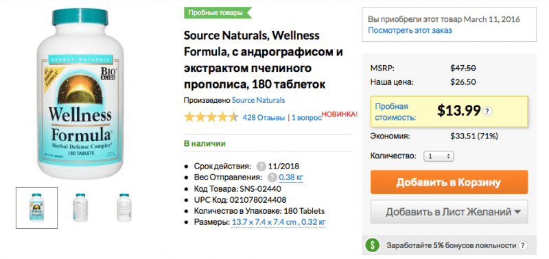 Во втором варианте нет эхинацеи, но есть много других полезных растительных экстрактов, к тому же, этот препарат сегодня идет со скидкой 12 долларов как «товар дня».