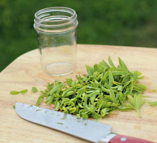 Стевия очень теплолюбивое многолетнее растение. Его можно вырастить у себя на участке рассадным способом. При этом на зиму стевию обязательно выкапывают и определяют в прохладное место в помещении. Собирать свежую зелень желательно в период цветения. В это время листва с максимальной мощностью синтезирует такие сладкие гликозиды, как стевиозид и ребаудиозид. Перед использованием стевию моют, обсушивают на салфетках, а затем нарезают произвольным образом.