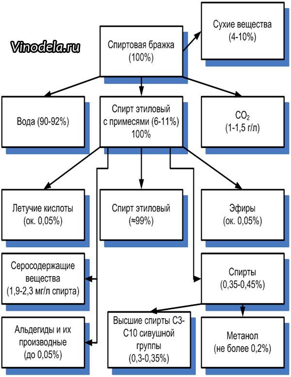 На схеме ниже приведен примерный состав готовой браги и примесей спирта.