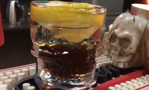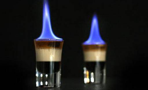 Как только появляется красное пламя, жидкость переливается во второй бокал, а первый переворачивается на салфетку с трубочкой. Далее жидкость из второго стакана необходимо быстро выпить, закусить все кофейными зернами и через трубочку вдохнуть пары, оставшиеся в первом стакане.