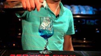 Затем слоями красиво уложите Айриш Крем и Блю Кюрасао, используя нож или коктейльную ложечку.