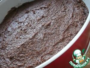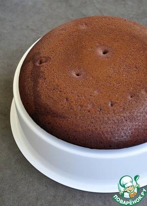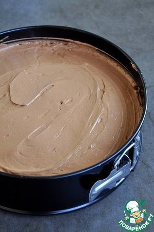 На дно разъемной формы для выпечки выложить пропитанный ликером бисквит, вылить сливочно-шоколадную массу, разровнять. Поставить в холодильник на ночь застывать.