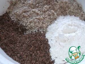 Миндаль, муку, разрыхлитель и измельчённый на тёрке шоколад перемешать.