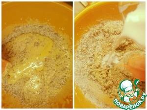 Добавить масло и теплое молоко, хорошо все перемешать, чтобы не было комков.