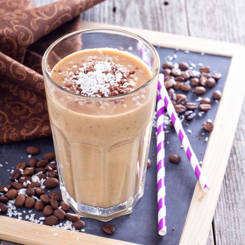 Калорийность блюда существенно снижается, если вместо мороженного использовать натуральный йогурт. При необходимости сразу получить холодный напиток, на стадии смешивания положите кубик льда. Коктейль, приготовленный без сливочного мороженого, посыпаем натертым шоколадом по аналогии со стандартным способом готовки.