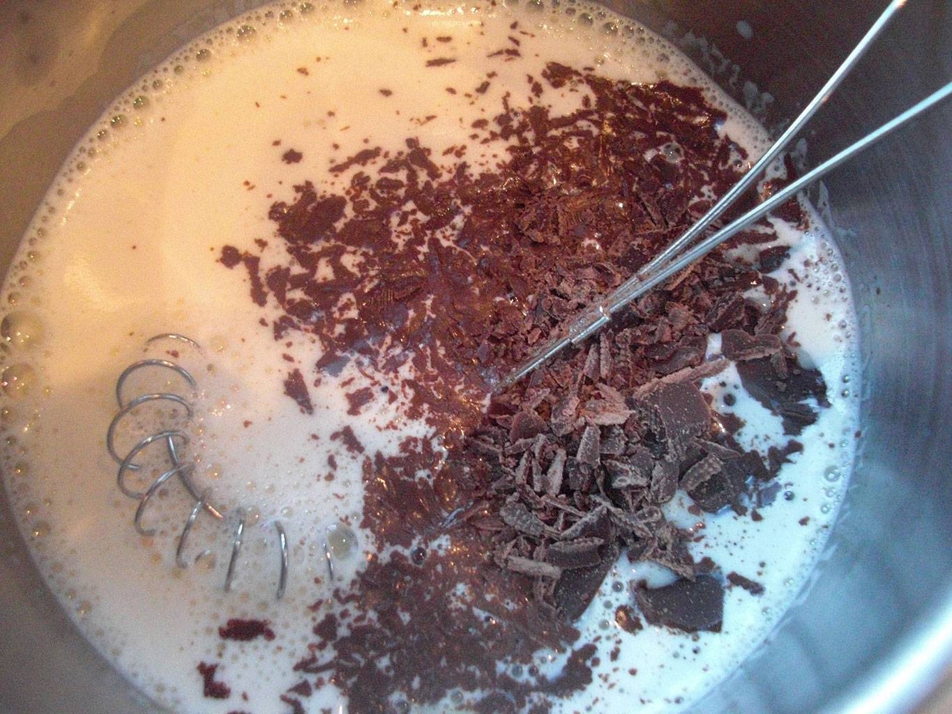 - Когда оно нагреется, добавляем шоколад, его следует поломать кусочки, и хорошенько помешивать, пока шоколад не станет с молоком единой консистенции.