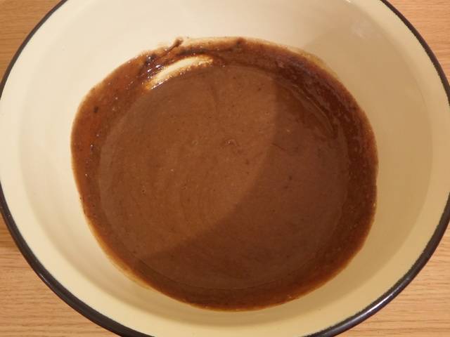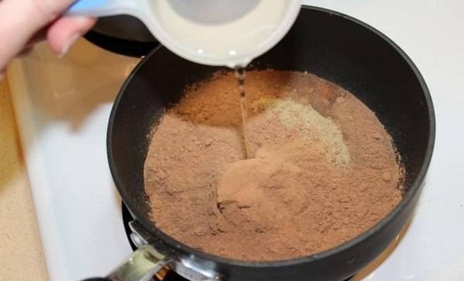 - Полученная смесь перекладывается в миску, после чего добавляется молоко и какао-порошок. Далее, небольшими порциями вливается горячая вода и размешивается до получения однородной консистенции.