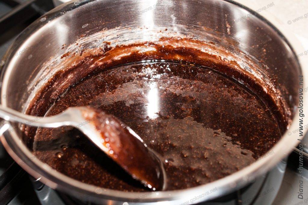 - Вносится, заранее растопленное на водяной бане, сливочное масло. Когда сладкая жидкость приобретет блестящий вид, сотейник снимается с плиты.