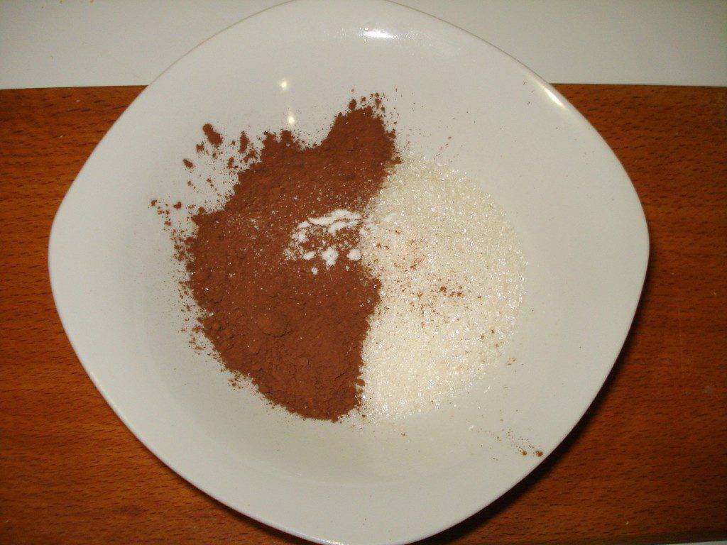 Смешать какао и сахарный песок в глубокой посуде. Оба продукта просеять и перемешать (перетереть). Смесь должна получиться полностью однородной, без комочков.