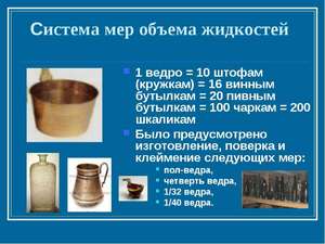 Но так как издревле на Руси люди обладали не только широкой душой, но и не слишком высокой организованностью, существовал также и сосуд под названием «осьмериковый». Туда входила уже одна восьмая ведра жидкости и именно он является прототипом бутылки для вина ёмкостью 0.75 литра, широко используемой в быту в настоящее время.