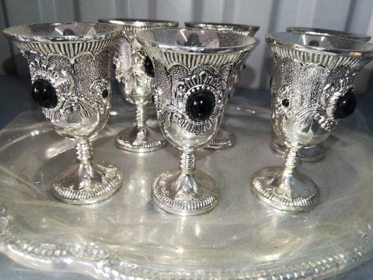 Сервировка стола из серебряных предметов создаст атмосферу грациозности и респектабельности. На изготовление стопок выбирают высокопробное столовое серебро.