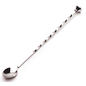 Ее еще называют коктейльной ложкой. Отличается она от обычной ложки в первую очередь длиной – барная ложка обычно длинная, чтобы можно было перемешивать напиток в глубоком стакане. Ее еще можно использовать и как мерник для сиропов или ликеров – объем самой ложки равен 5 мл. Ручка обычно делается в виде спирали, что упрощает не только вращательные движения внутри напитка, а и является прекрасным желобом для наливания. Если лить жидкость на спираль сверху вниз, то к своему логическому завершению жидкость потеряет скорость и мягко ляжет на другую жидкость. Это я про наслаивание, если вы не поняли =). Для этого, коктейльная ложка оснащается металлическим кругом на противоположной стороне, который прикреплен или прикручен четко посередине. Всеми любимый Б-52 делается в основном с применением барной ложки. Иногда, вместо круга на другом конце располагается небольшая вилка, которой удобно вылавливать из банок оливки и вишенки, а также делать другие украшения.