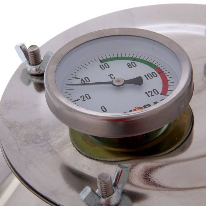 Если в системе нет термометра, можно установить его собственноручно. Техническая сторона вопроса не представляет собой никакой сложности. Достаточно просто установить в нужном месте подходящий уплотнитель для соблюдения герметичности. Если в качестве аппарата применяется скороварка, в крышке придется просверлить отверстие. Туда вставляются термостойкие прокладки и сам термометр. Если прибор будет соприкасаться с металлическими стенками, их температура будет фиксироваться вместе с содержимым.