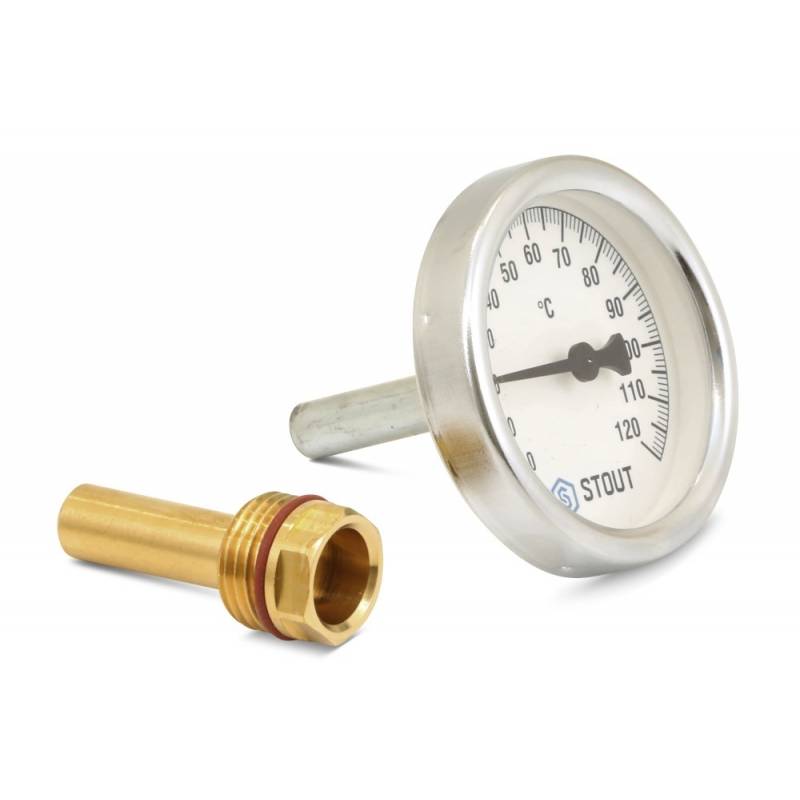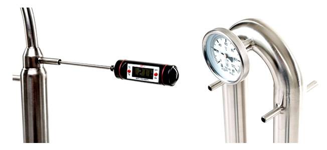 - Узел отбора. В ректификационных колоннах температура выходящих паров и флегмы — самый важный параметр. Лучше всего температуру измерять чуть выше отверстия отбора. Отлично подойдет биметаллический или цифровой термометр с датчиком-штырьком.