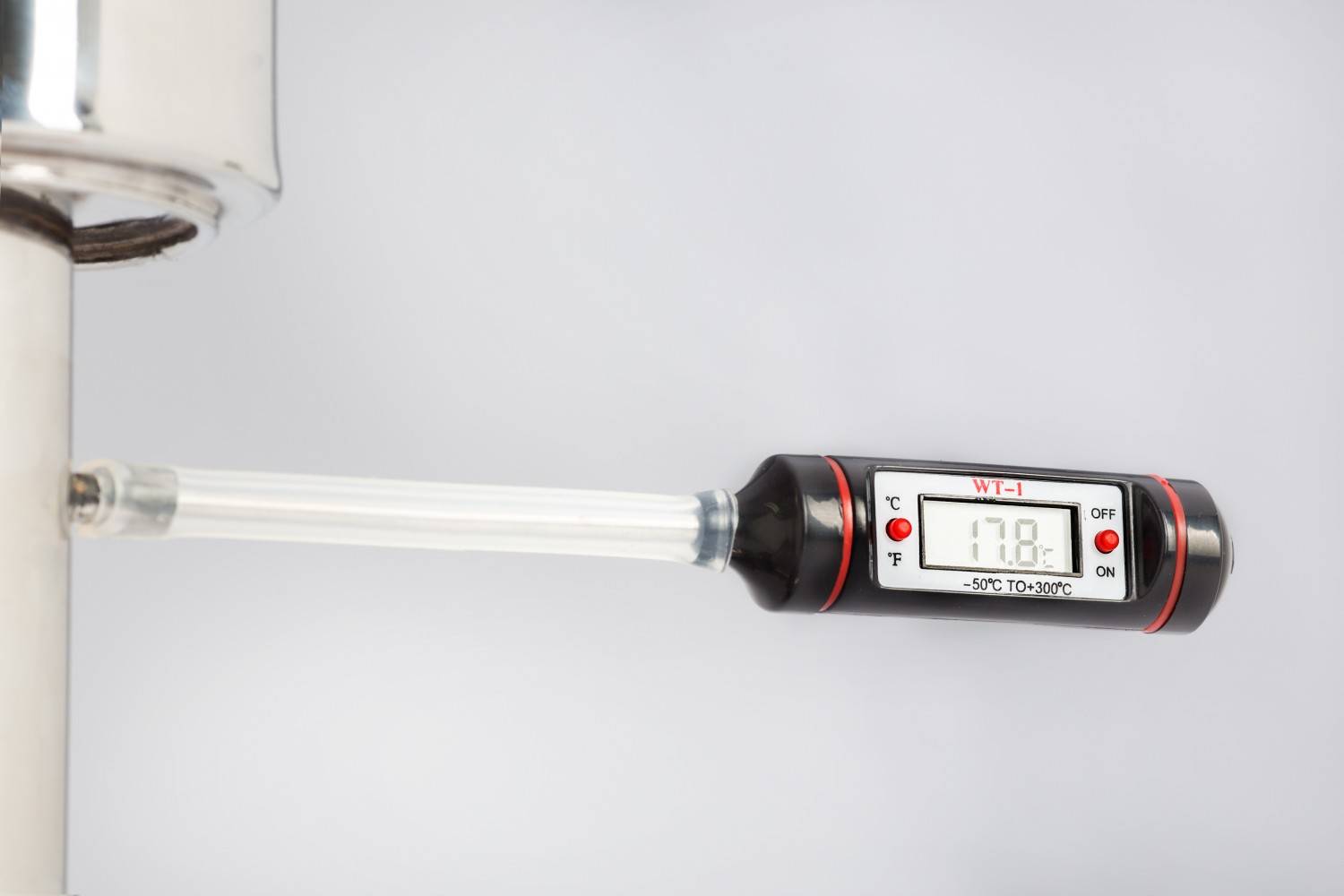Цифровой термометр оборудован износоустойчивым датчиком с проводом, чья длина превышает 1 м. Некоторые самогонщики изготавливают такой градусник своими руками и активно эксплуатируют их в бытовых целях. Для точных измерений важен тесный контакт щупа с дистиллятом или паром. Чтобы защитить прибор, зонд помещается в гильзу.