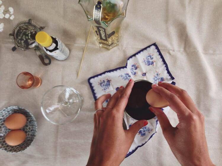- в шейкер положить 1 яйцо и влить сироп и джин;