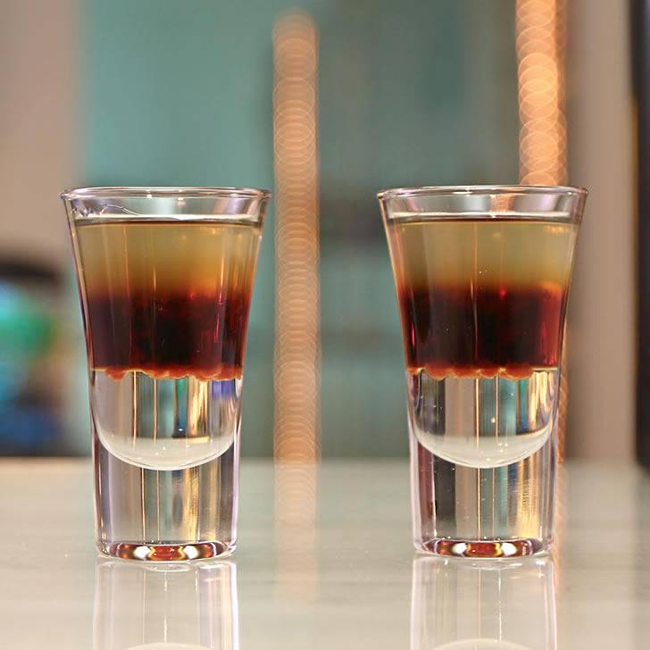 — аккуратно добавляется 5 капель соуса «Табаско» (наименование торговой марки соусов, изготовленных из мякоти спелых плодов кайенского перца), которые должны зависнуть между слоями, сформировав характерный разделительный слой рыжего цвета.