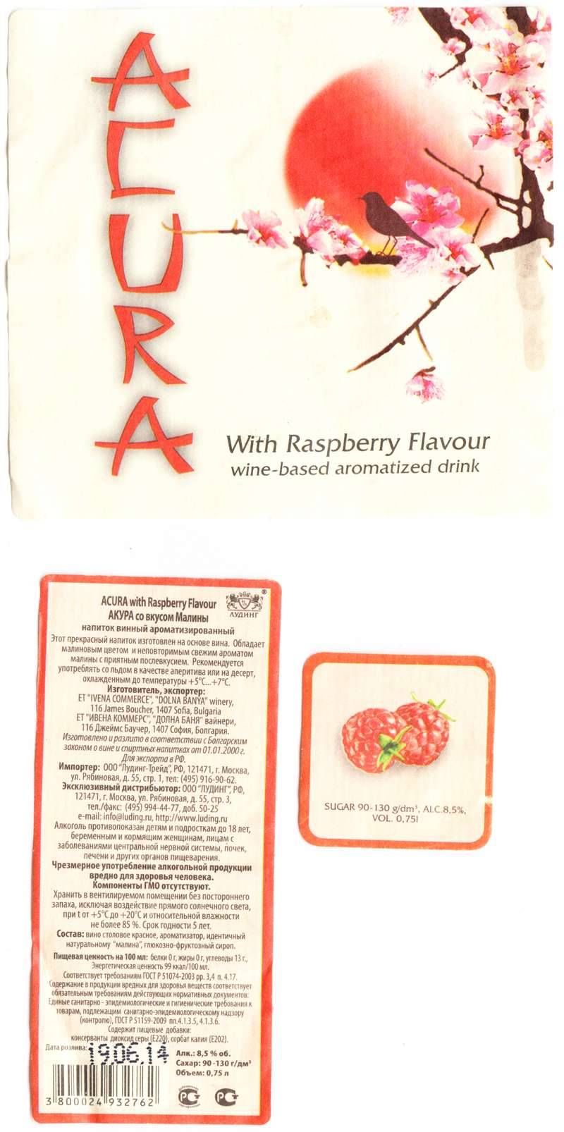 Малиновое вино – яркий представитель болгарской винодельческой марки «Акура». Технология его производства самая обычная, как и у остальных красных вин, но специалисты решили разнообразить вкус и добавили в него малиновый сок. Напиток получился с приятным ароматом ягод и насыщенным красным цветом.