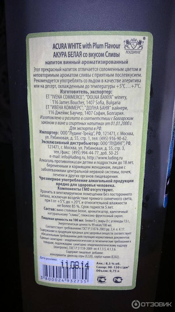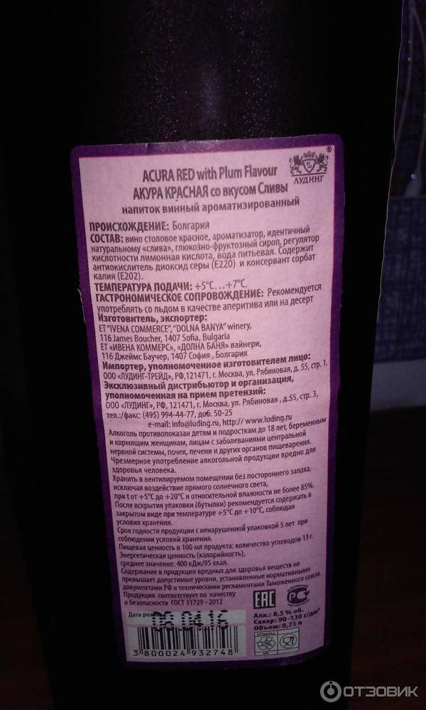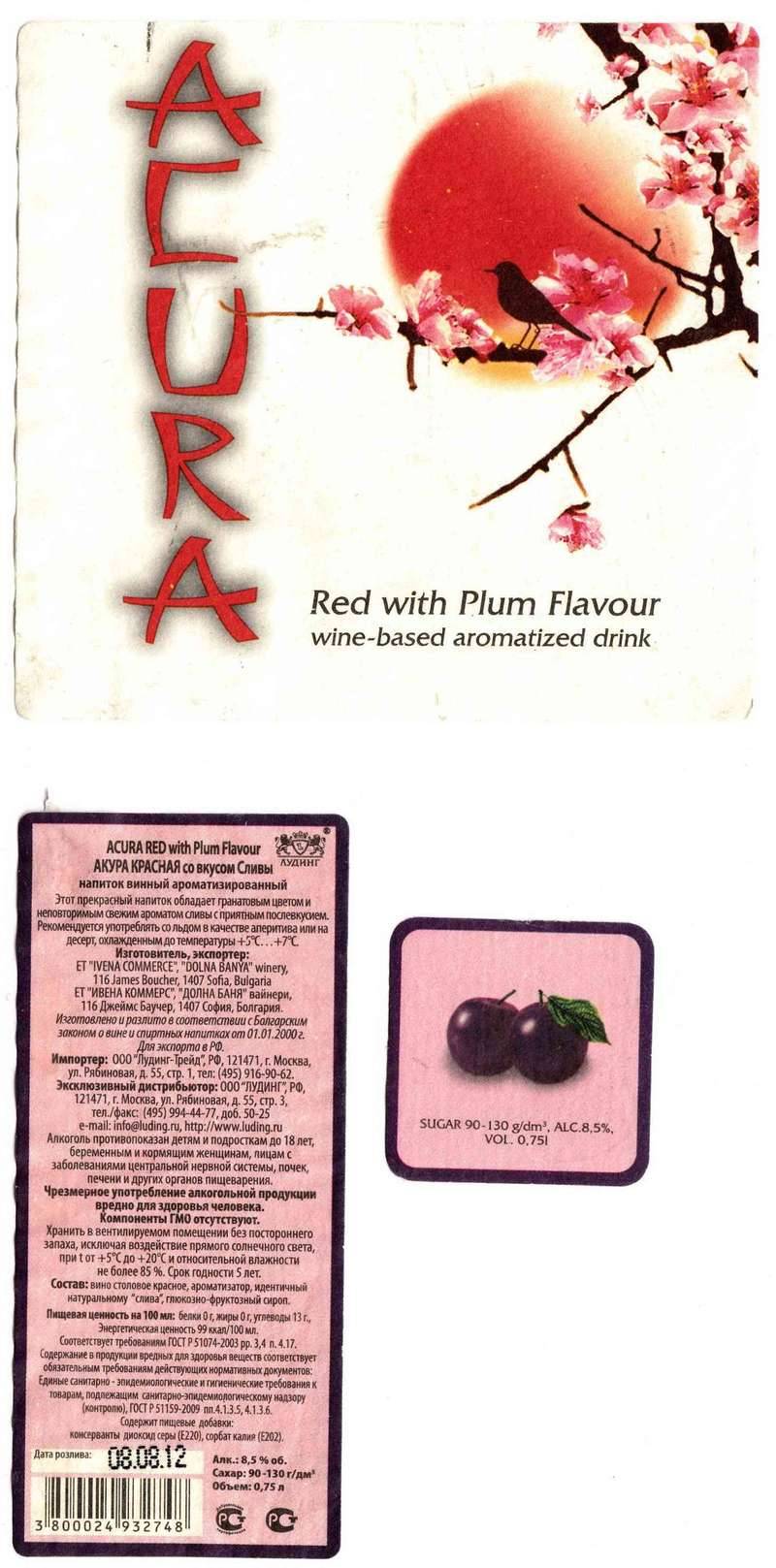 Этот винный напиток мне приходилось пробовать дважды. Один раз — со вкусом белой сливы, другой — красной. Напиток, конечно, весьма сладкий и в целом его можно назвать приятным. Но лишь при условии, что настоящее сухое вино вы не цените и пьете исключительно полусладкие «компоты». Кстати, слово «компот» по отношению к данному напитку вполне уместно. Выпускаются вина Acura в нескольких вариантах: малина, красная слива, белая слива, гранат. Как в стеклянных бутылках (0.75 л.), так и в картонных пакетах, как сок (емкостью 1, 1.5, 2 литра). Что плохо, в составе присутствует ароматизатор идентичный натуральному. А собственного сливового вина в Acura нет вообще. В обычное виноградное вино добавлены глюкозно-фруктозный сироп и ароматизатор. В результате — сладкий вкус и некий намёк на сливу.