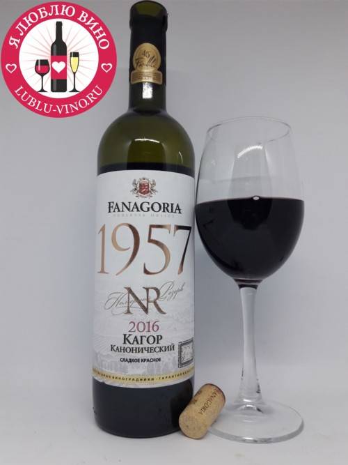 • Кагор «NR 1957» Кагор Канонический, производитель Фанагория. Вино отличается приятным шоколадным вкусом со сливочным послевкусием. Аромат вина вишневый, терновый.