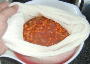 На первом этапе приготовления вина, необходимо подготовить ягоды. Перебираем их, оставляя только хорошие. Затем их необходимо измельчить. Делаем это при помощи толкушки или мясорубки. Подойдет и блендер. После измельчения берем марлю и с ее помощью отжимаем измельченные ягоды. В результате из 6 кг ягод получаем около 4 литров сока. Сок пока можно убрать в холодильник, а нам понадобятся отжатые ягоды.