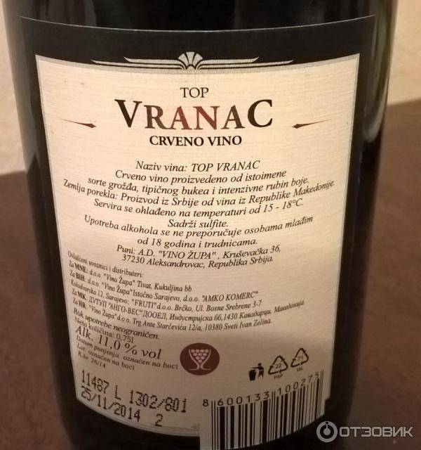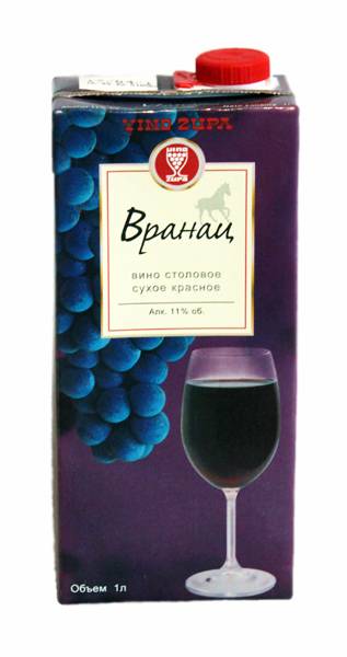 Впрочем, на полках российских алкошопов с большим ассортиментом продукции можно найти вино из сорта Вранац. И оно будет прельщать ценой. Ведь напиток содержится не в стекле, а в тетрапаке. Называется он Zupa. Если посмотреть на состав и страну-производителя, то на этикетке указывается: 100 % «Вранац», вино, Сербия. Но начинать знакомство с этим сортом с «Зупа» гурманы не советуют. Грозди были куплены компанией от различных виноградарей, и терруар у напитка самый пестрый. На Балканах он занимает наиболее низкий ценовой сегмент. Но это вино годится для сопровождения нехитрого будничного обеда. У него красивый темно-красный цвет, запах лесных ягод и приятный свежий вкус. Сухое вино с кислинкой скрадывает жирность блюд из свинины. Подают его слегка охлажденным (до восемнадцати градусов).
