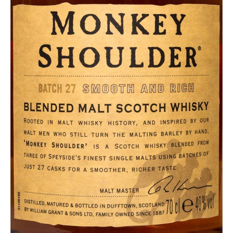 «Monkey shoulder» переводится как «обезьянье плечо». Странное название, но его вынесли на этикетку не зря. Это своеобразная дань уважения тем, кто изо дня в день трудится на предприятиях по изготовлению виски — мастерам солодовен. Сейчас, когда заводы стали современнее, их работа уже не такая тяжелая. Но раньше мастера при просушке солода периодически переворачивали его деревянными лопатами. Тяжелый труд, который нередко приводит к профессиональному заболеванию, — искривлению плечевого сустава. Эта патология и называется «обезьянье плечо» — визуально одна или сразу обе руки выглядят длиннее.
