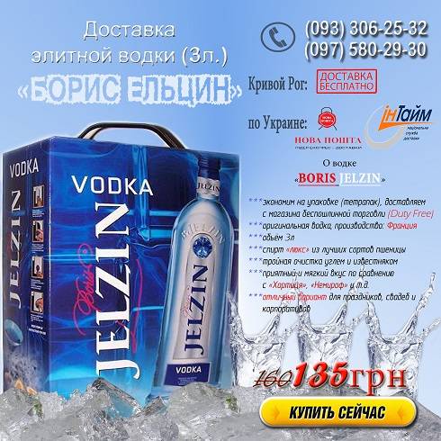 Boris Jelzin Original. Обладает мягким привкусом и абсолютной прозрачностью. В аромате отсутствуют резкие ноты, что делает продукт идеальным для создания коктейлей.