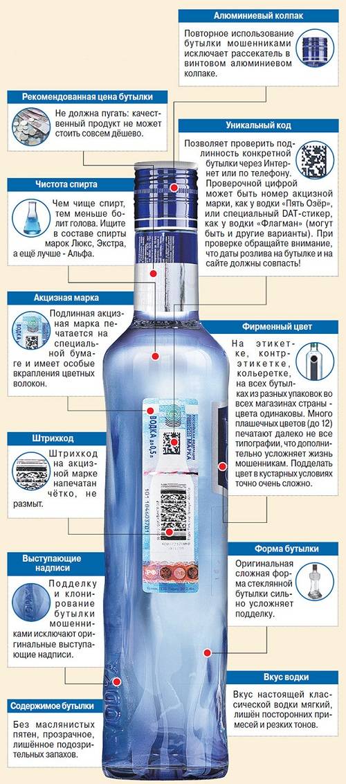 6. Защита производителей. Понимая, что покупателю сложно отличить хорошую водку от паленой, известные бренды разрабатывают собственные системы защиты, сложно поддающиеся подделке. Это могут быть нанесенные на бутылку рельефные знаки, гербы и другие маркеры качества.