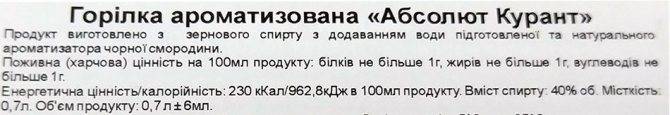 Для эталонного примера мы приведем состав ароматизированной водки от ведущего мирового производителя — Absolut Kurant (Черная смородина):