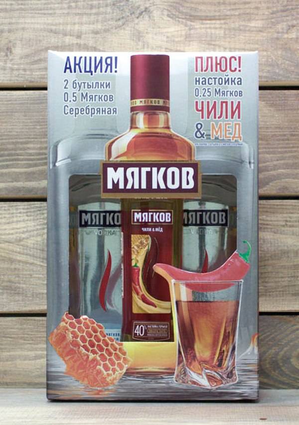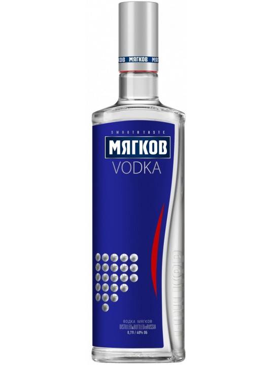 Myagkov (40%). Классическая водка, в составе которой, кроме спирта и мягкой воды, есть натуральный мёд, поэтому медовые ноты слышны в тонком аромате, а мягкий вкус оттеняет лёгкая медовая сладость согревающего послевкусия.