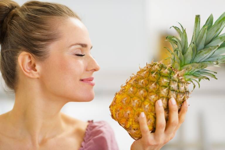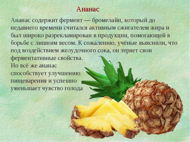 Ананас способен влиять на процесс похудения. Дело в том, что в его составе присутствуют пищевые волокна, оказывающие благоприятное воздействие на пищеварительный тракт, и бромелайн, который расщепляет белки. Более того, в этом фрукте содержатся биологически активные вещества, которые ускоряют метаболизм. Поэтому для женщин, желающих избавиться от лишних сантиметров на талии, ананас — настоящая находка.
