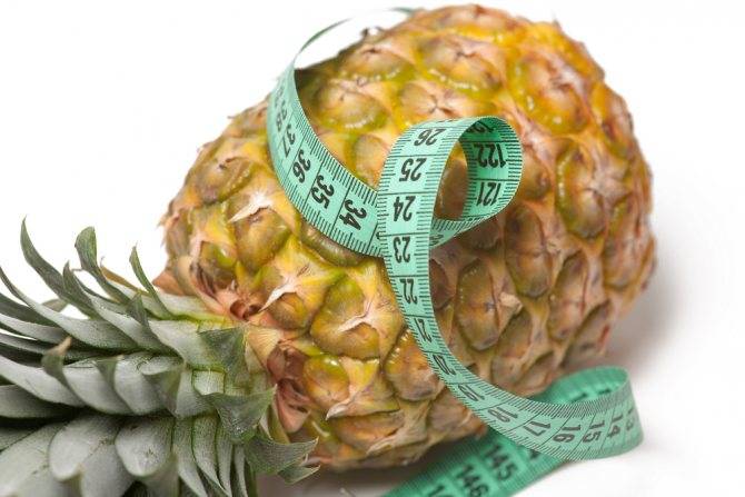 Также ананас известен как незаменимый продукт для тех, кто следит за стройностью своей фигуры или хочет сбросить несколько килограммов. Эти полезные свойства ему обеспечивает комплекс особых ферментов (бромелайн). Некоторые специалисты, однако, опровергают жиросжигающие свойства ананаса. Как они утверждают, эффект уменьшения веса достигается за счет ускорения пищеварительного процесса, а также низкой калорийности этого фрукта. Польза для организма в целом, и для похудения в частности, увеличится в разы при проведении разгрузочного ананасового дня. С этой целью нужно 1 фрукт разделить примерно на 5 частей и съесть его в течение суток.
