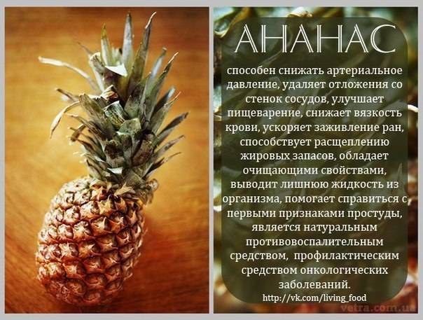• Благотворно влияет на сердце и сосуды. Ананас является проверенным профилактическим средством от инсультов и инфарктов. Он способствует очищению сосудов от холестериновых бляшек, делает их менее ломкими.
