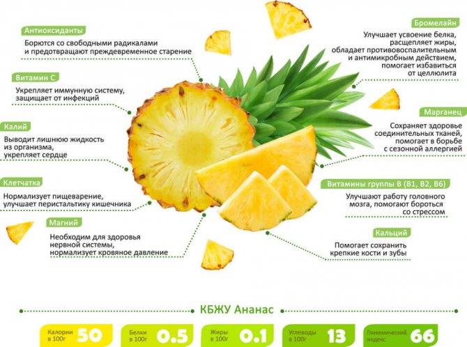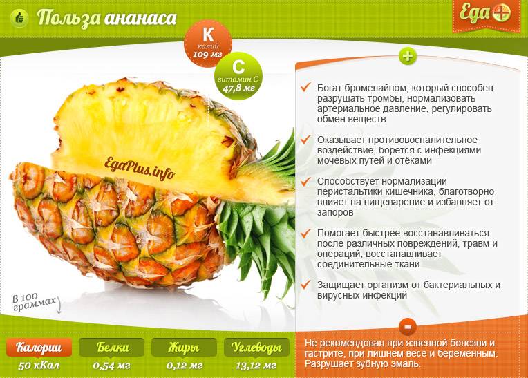 • Польза ананаса для здоровья также состоит в том, что он имеет противоотёчные свойства. Его стоит употреблять в пищу тем, у кого больные почки. Не меньше 0,5 кг мякоти свежего ананаса или 1 ст. сока.