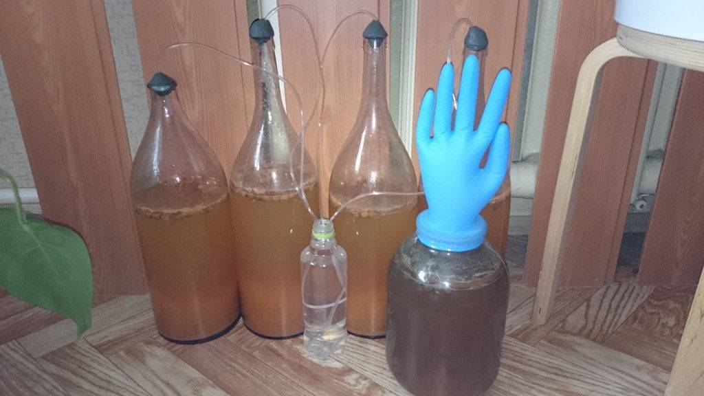 - Брожение длится от 10 дней до трех недель, в зависимости от температуры окружающей среды (не меньше 18, но не больше 30°), сахаристости фруктов и других факторов. Готовность вина определяется по гидрозатвору: если он перестал булькать (или перчатка «Привет Горбачёву» спустилась) – все готово.