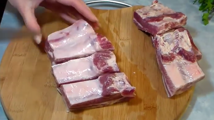 1. Рёбрышки тщательно промываем холодной водой, вырезаем жилки и пленки. Далее нарезаем порционными кусочками (по 2-3) ребра.