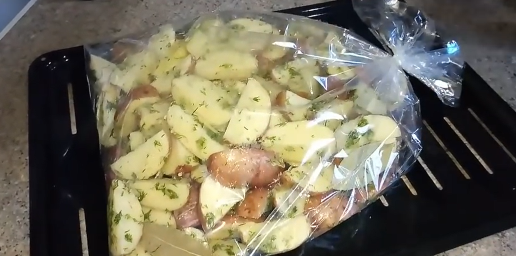 4. Для запекания используем рукав. Для этого укладываем ребрышки в рукав, а сверху картошку. Туда же отправляем лавровый лист. Рукав завязываем. Запекать нужно при температуре 200 градусов около часа.