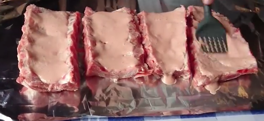 Теперь разрежем по порционным косточкам и положим ребрышки на лист фольги. Кстати, продукты в фольгу нужно укладывать так, чтобы блестящая сторона была внутри. Подробнее о том, как пользовать фольгой, я писала в одной из моих статей. Смажем их с обеих сторон маринадом. Смазываем довольно густым слоем.