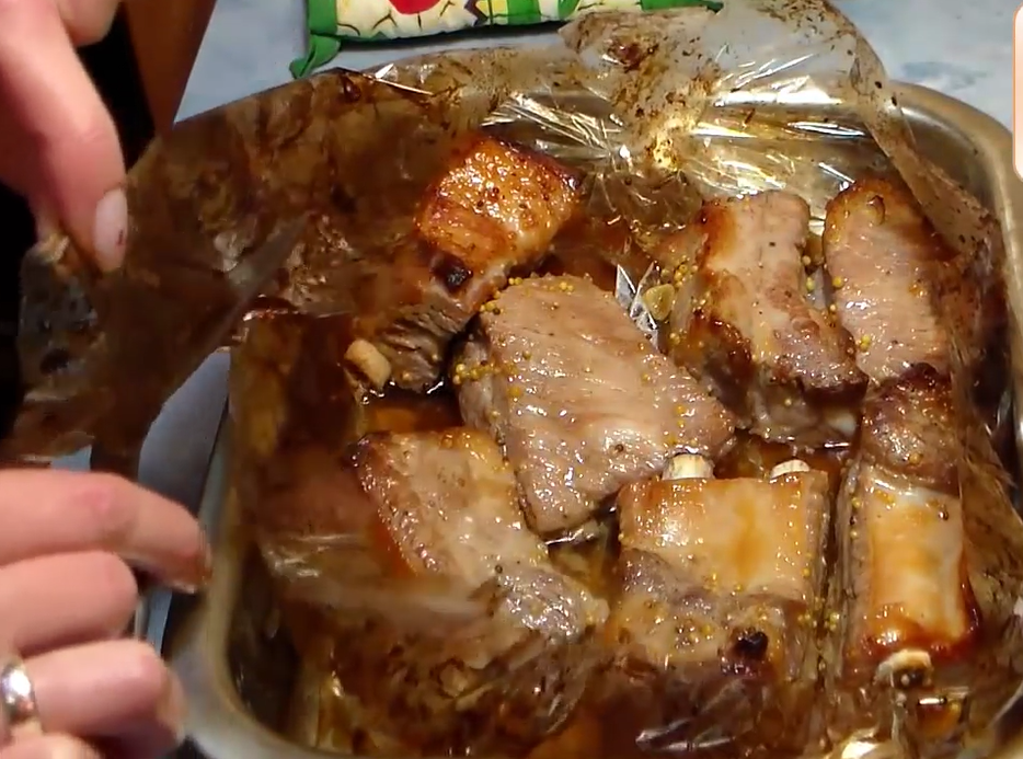 В рукаве мясо выделяет сок и ребрышки получаются как бы тушеными. Если хотите получить красивую зажаренную корочку, то можно в рукаве запекать 40 — 50 минут, а затем на 10 минут включить режим «Гриль», при этом разрезав рукав ножницами.
