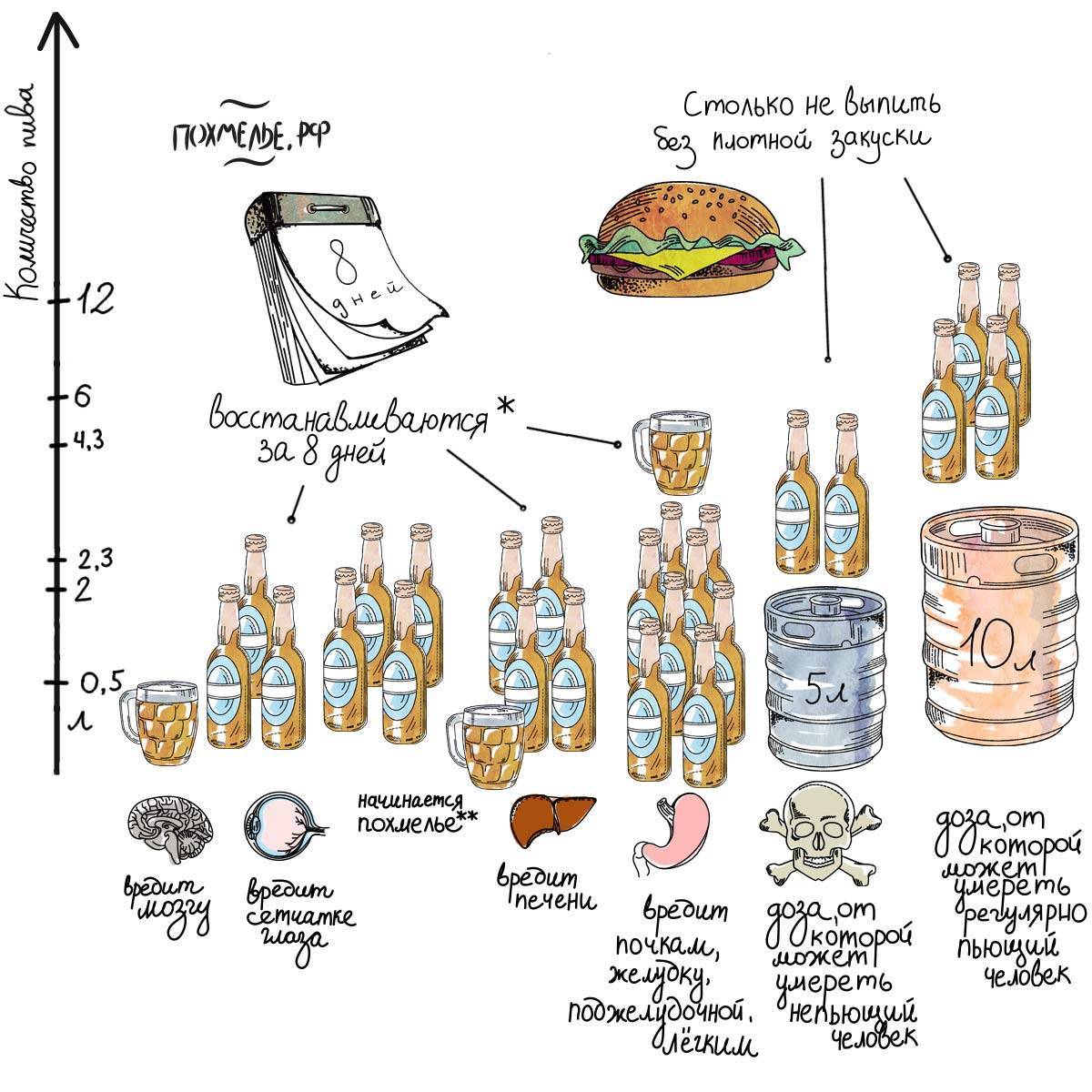 Другие органы, повреждаемые воздействием алкоголя (печень, почки, поджелудочная железа, лёгкие и глаза), восстанавливаются гораздо эффективнее, чем мозг, только для этого надо пить в меру и давать этим органам время на восстановление. Дело в том, что есть предел способности здорового человека переработать алкоголь. Для среднестатистического человека весом 70 кг этот предел составляет 170 г в сутки (538 мл водки). После такой дозы необходимо не менее 8 дней отдыхать от алкоголя, давая организму время на восстановление. Тогда пострадавшие от негативного воздействия органы смогут вернуть полноценную работоспособность и не продолжат разрушаться во время следующей пьянки.