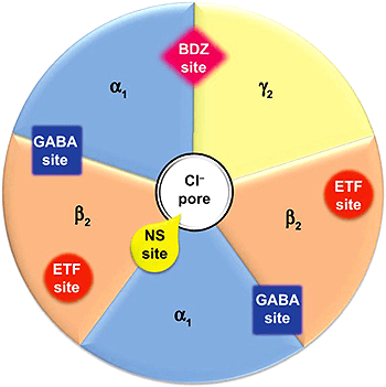 Рисунок 8. Рецептор ГАМКА и сайты связывания с лекарственными препаратами. Наиболее распространенная в ЦНС комбинация субъединиц (около 40 % ГАМКА-рецепторов) — двух α1, двух β2 и одной γ2s, располагающихся вокруг хлоридной поры (вид сверху). GABA site (на поверхности, стык α и β) — место, где ГАМК присоединяется к рецептору; BDZ site (на поверхности, стык α и γ) — сайт связывания бензодиазепинов, ETF site (на β) — этифоксина, NS site (в канале) — нейростероидов. Сайты связывания барбитуратов и этанола предположительно находятся в глубине канала (на трансмембранных доменах). В первом случае, вероятно, главную роль играет β-субъединица, с этанолом же взаимодействуют разные субъединицы, включая ρ и δ, но их чувствительность различается.