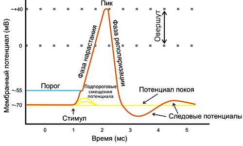Необходимо изменение содержания ионов внутри и снаружи клетки такой силы, чтобы значение заряда на мембране изменилось и достигло определенного порога. Если это происходит, то мембрана продолжает деполяризоваться дальше, нейрон возбуждается и передает сигнал другим клеткам. Овершут (инверсия) — период, когда потенциал мембраны положителен. Затем следует фаза реполяризации, и заряд мембраны возвращается к прежним значениям.
