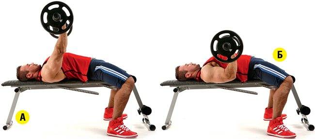 - Жим штанги под положительным углом 3 подхода по 8-10 повторений.