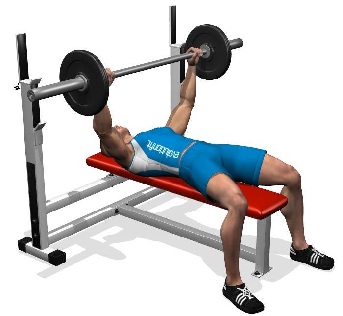 - Жим штанги лежа 3-5 подходов по 8-12 повторений.