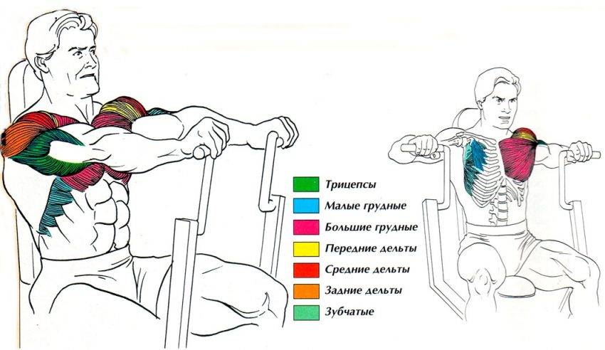 По биомеханическому типу это обычное жимовое движение. В таких включаются мышцы передней поверхности тела, а также широчайшие и ромбовидные как стабилизаторы. В силу характера упражнения включение спины возможно только в статике, так как в тренажере мы исключаем сталкивание снаряда с груди.