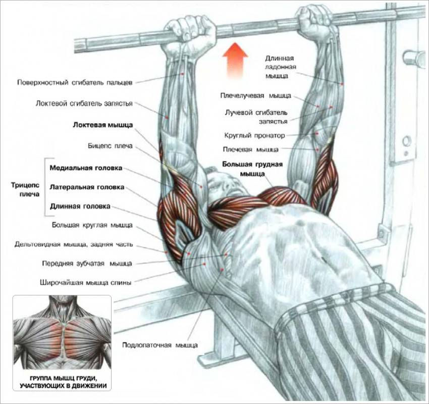 - Трицепсы и передние дельты как вспомогательные
