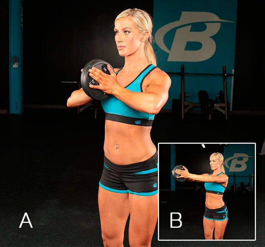 - Диски нужно сжать ладонями, прижав один к другому. Изометрическое напряжение мышц груди выполняется еще на старте движения
