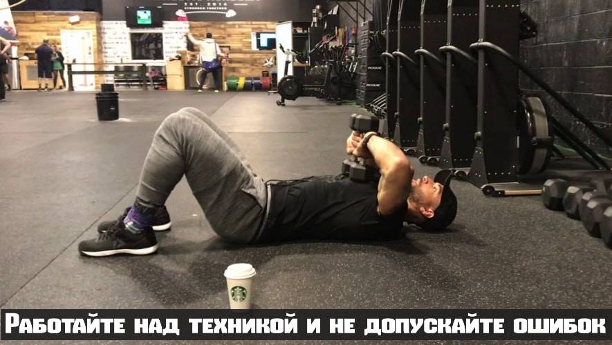 - Использование слишком большого веса. Тяжелые гантели, не дадут вам технически правильно выполнить упражнение. В момент подъема, вы можете не справиться с весом, и уроните гантели себе на грудную клетку.