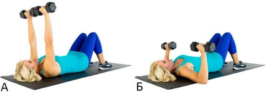 Классический жим гантелей. В данном случае снаряды следует приподнимать к проекции плеч максимально одновременно и плавно, фиксируя локти на уровне ушной раковины с небольшим поворотом внутренней части запястья к груди.